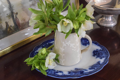 What I mean by this is: don’t be afraid to mix in things such as greenery or cozy objects like candles. This can add visual interest to your overall design scheme, while also giving a texture and ambiance to the particular room you’re designing. For example, think about putting an English style boxwood plant in a pottery planter on top of an antique table, layering in earthy elements by incorporating handmade with antique. Or layer in a handmade candle sitting on top of antique books or an antique coffee table. There are just so many possibilities!